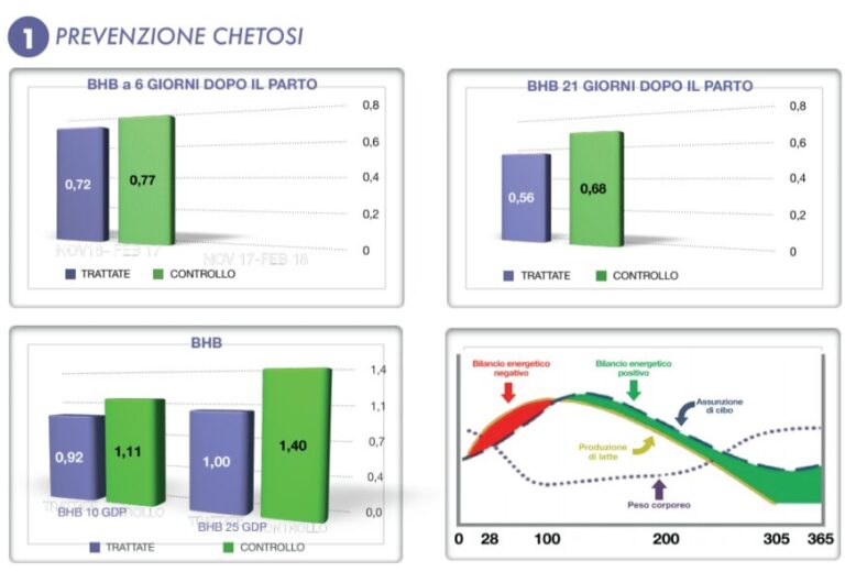 - PREVENZIONE CHETOSI: test eseguiti a 7-14-21 giorni dopo il parto in cui è stato valutato il livello di BHB, ha evidenziato come nelle vacche trattate i livelli di BHB siano più bassi rispetto al controllo