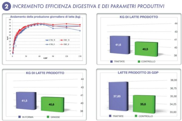 - INCREMENTO DELL’EFFICIENZA DIGESTIVA E DEI PARAMETRI PRODUTTIVI: dalla valutazione dell’andamento della produzione giornaliera di latte il gruppo trattato ha evidenziato una produttività maggiore rispetto al controllo
