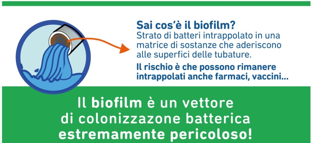 Con biofilm si intende uno strato di batteri intrappolato all’interno di una matrice di sostanze che aderiscono alla superficie degli impianti idrici(tubature,serbatoi…) e che si viene a formare a causa di una cattiva igiene e gestione dell’acqua potabile.